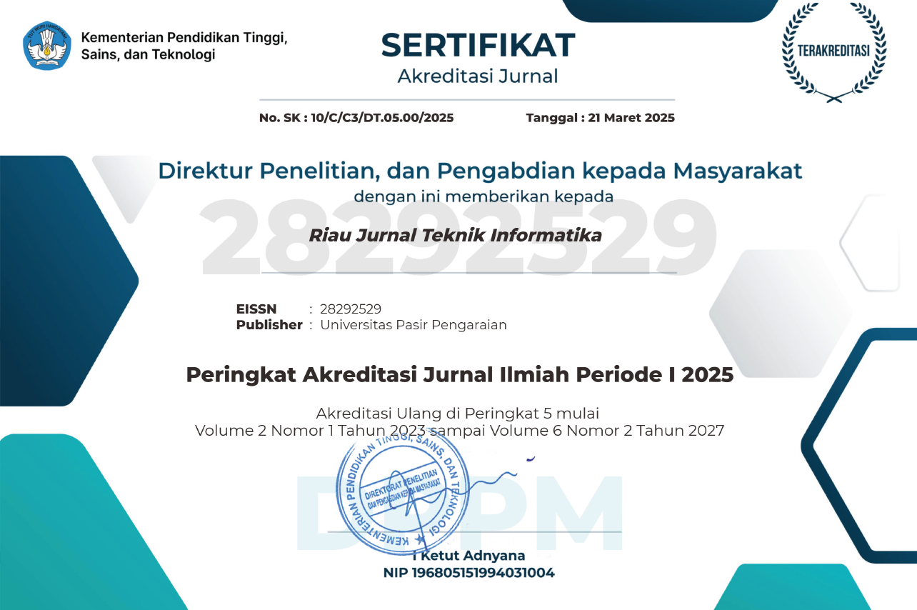 Kami menginformasikan mulai tahun 2026 bahwa telah terjadi perubahan template untuk penulisan artikel di Riau Jurnal Teknik Informatika. Perubahan ini dilakukan untuk meningkatkan kualitas dan konsistensi artikel yang diterbitkan. Oleh karena itu, seluruh penulis yang akan mengirimkan artikel ke jurnal ini diwajibkan untuk menggunakan template terbaru.